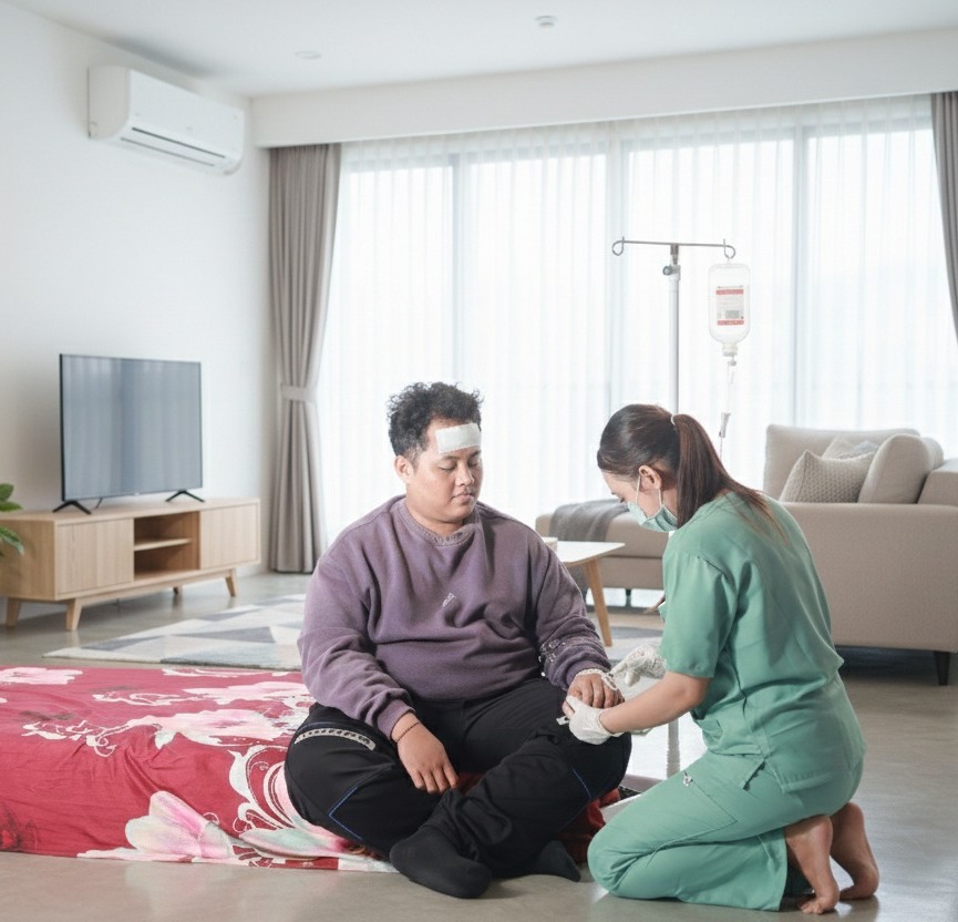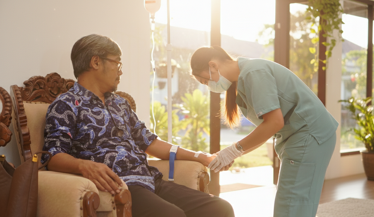 Layanan infus vitamin dan perawatan medis oleh perawat profesional bersertifikat. Aman, nyaman, dan penuh perhatian langsung di rumah Anda.
